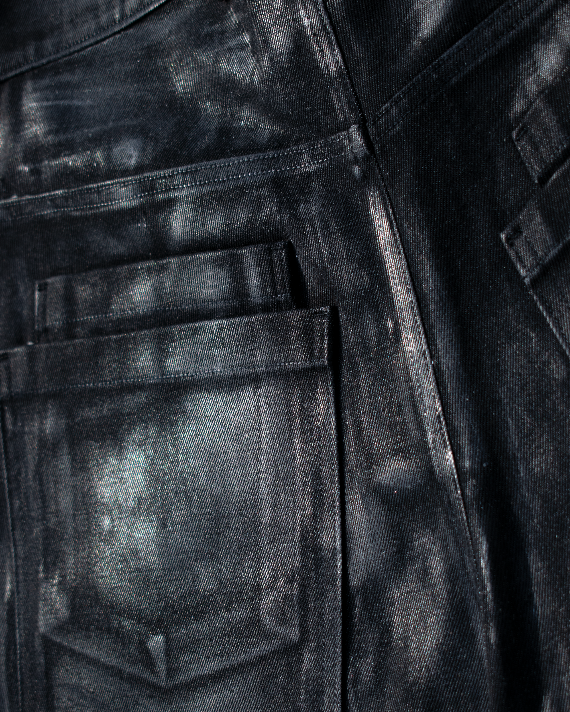 EACH PIECE IS TREATED WITH A HEAVY WAX COATING THAT CREATES A DEEP SHEEN AND STRUCTURED FEEL, TRANSFORMING THE MATERIAL’S NATURAL DRAPE INTO A SCULPTURAL SILHOUETTE.