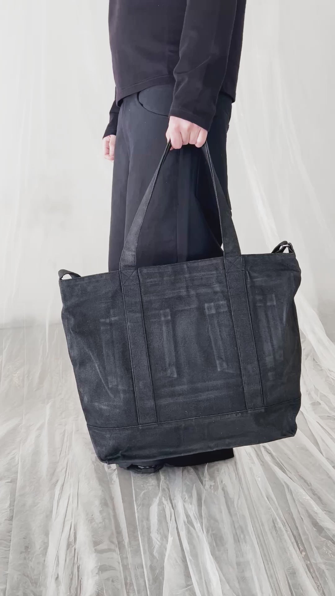 CRAFTED IN OUR COPENHAGEN ATELIER, THE WAXED BAG IS MADE FROM PREMIUM BLACK RAW DENIM AND FINISHED WITH A HEAVY WAX COATING. IT FEATURES AN ADJUSTABLE STRAP, A LAPTOP POCKET, TWO JEANS-STYLE POCKETS, AND A ZIPPER.