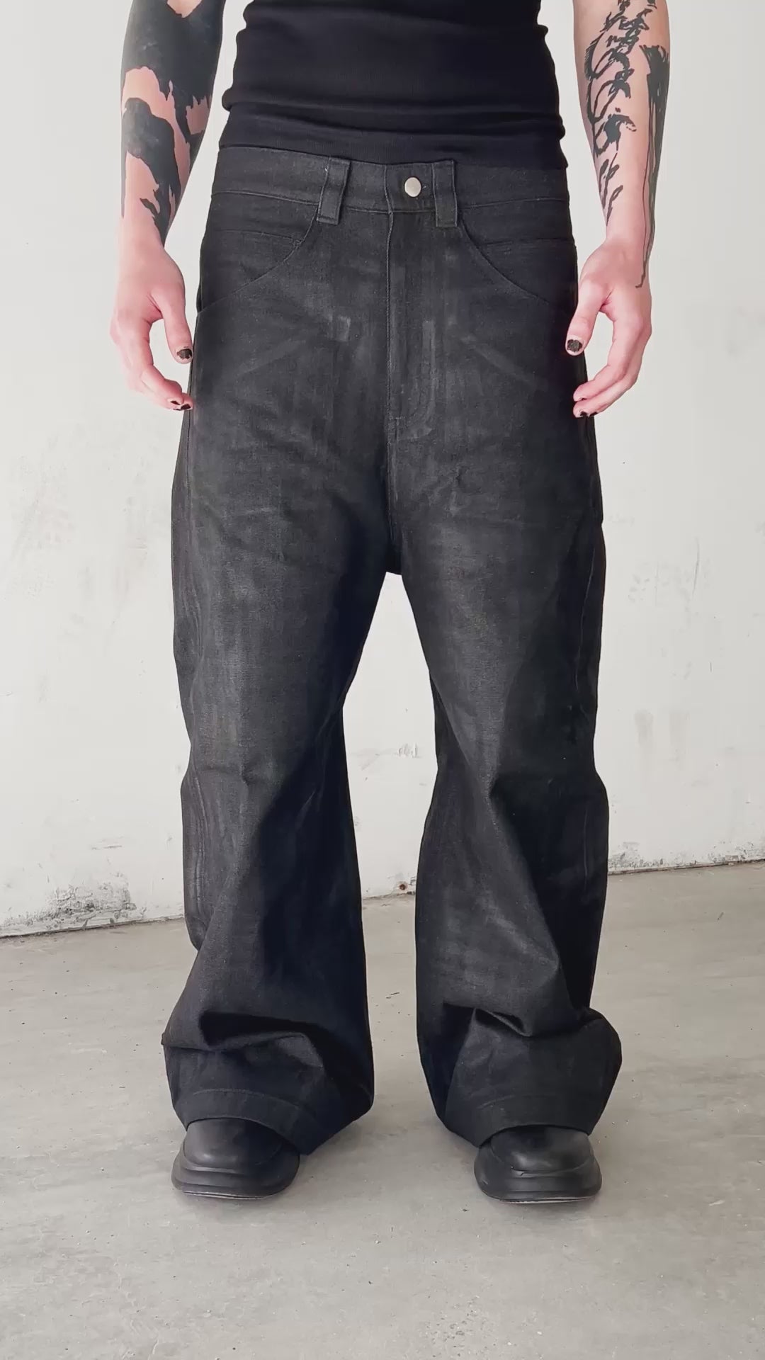 CRAFTED IN OUR COPENHAGEN ATELIER, THE WAXED WIDE JEANS ARE CUT FROM PREMIUM 10OZ RAW BLACK DENIM AND FINISHED WITH A HEAVY WAX COATING. DESIGNED WITH LAYERED BACK POCKETS AND KNEE DARTS FOR AN EXAGGERATED SILHOUETTE.